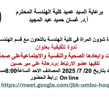 برعاية السيد عميد كلية الهندسة المحترم أ.د. غسان حميد عبد المجيد وضمن الخطة الوطنية الاستراتيجية الامن والسلام للمراة العراقية ركيزة ... المزيد
