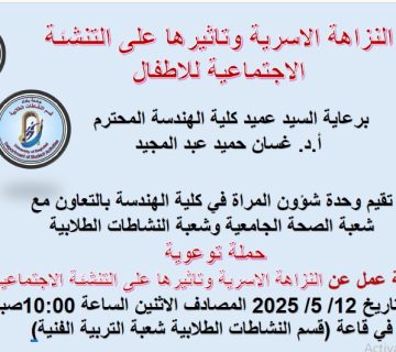 إعــــلان: ضمن حملة توعوية… هندسة بغداد تنظم ورشة عمل عن النزاهة الأسرية وتأثيرها على تنشئة الأطفال