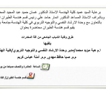 إعــــلان: كلية الهندسة بجامعة بغداد تنظّم ورشة توعوية حول وقاية الشباب الجامعي من آفة المخدرات