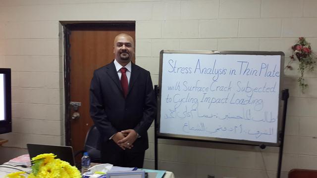 تم انجاز رسالة الماجستير للطالب بسام علي أحمد في قسم الهندسة الميكانيكية عن بحثه الموسوم ” تحليل ألاجهادات في صفيحه رقيقه تحتوي على شق سطحي معرضه الى حمل صدمة متكررة” وبأشراف أ.م.د. فتحي عبدالصاحب الشماع