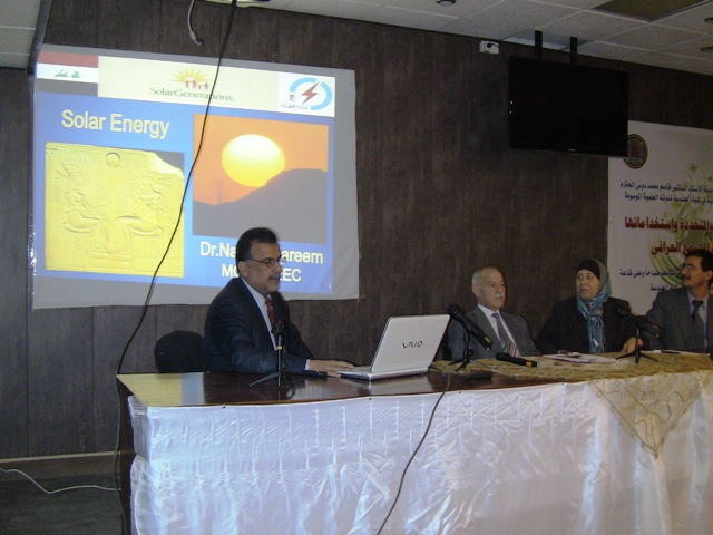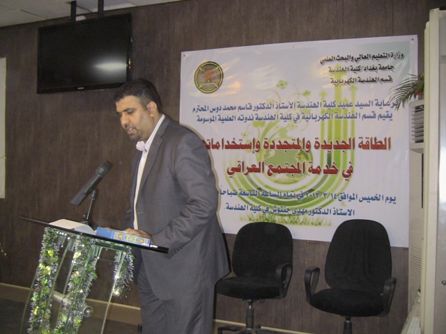 اقام قسم الهندسة الكهربائية في الكلية ندوة تحت عنوان “الطاقة الجديدة والمتجددة واستخداماتها في خدمة المجتمع ألعراقي على قاعة الدكتور مهدي حنتوش في كلية الهندسة بحضور الاستاذ المساعد الدكتور علاء كريم محمد مساعد رئيس جامعة بغداد للشؤون ألعلمية ، الاستاذ الدكتور قاسم محمد دوس عميد كلية الهندسة ، الدكتور ضياء جاسم كاظم رئيس قسم الهندسة الكهربائية ، مجموعة من التدريسيين ، والطلبة والمهتمين بشأن الطاقة الجديدة والمتجددة.المحاضرون الذين اشتركوا في هذه الندوة هم الاستاذ الدكتور علي محسن المشاط ،مستشار في وزارة التعليم العالي والبحث ألعلمي،الدكتور نصير كريم قاسم ،مدير قسم الطاقات المتجددة في وزارة الكهرباء، المهندس ماجد حسن علي،مدير مركز بحوث الطاقة والبيئة في وزارة الصناعة،المدرس الدكتور فاضل عباس مهدي،تدريسي في فسم الهندسة الكهربائية والمدرس سيف الدين عبد الامير، تدريسي في قسم الهندسة الكهربائية.