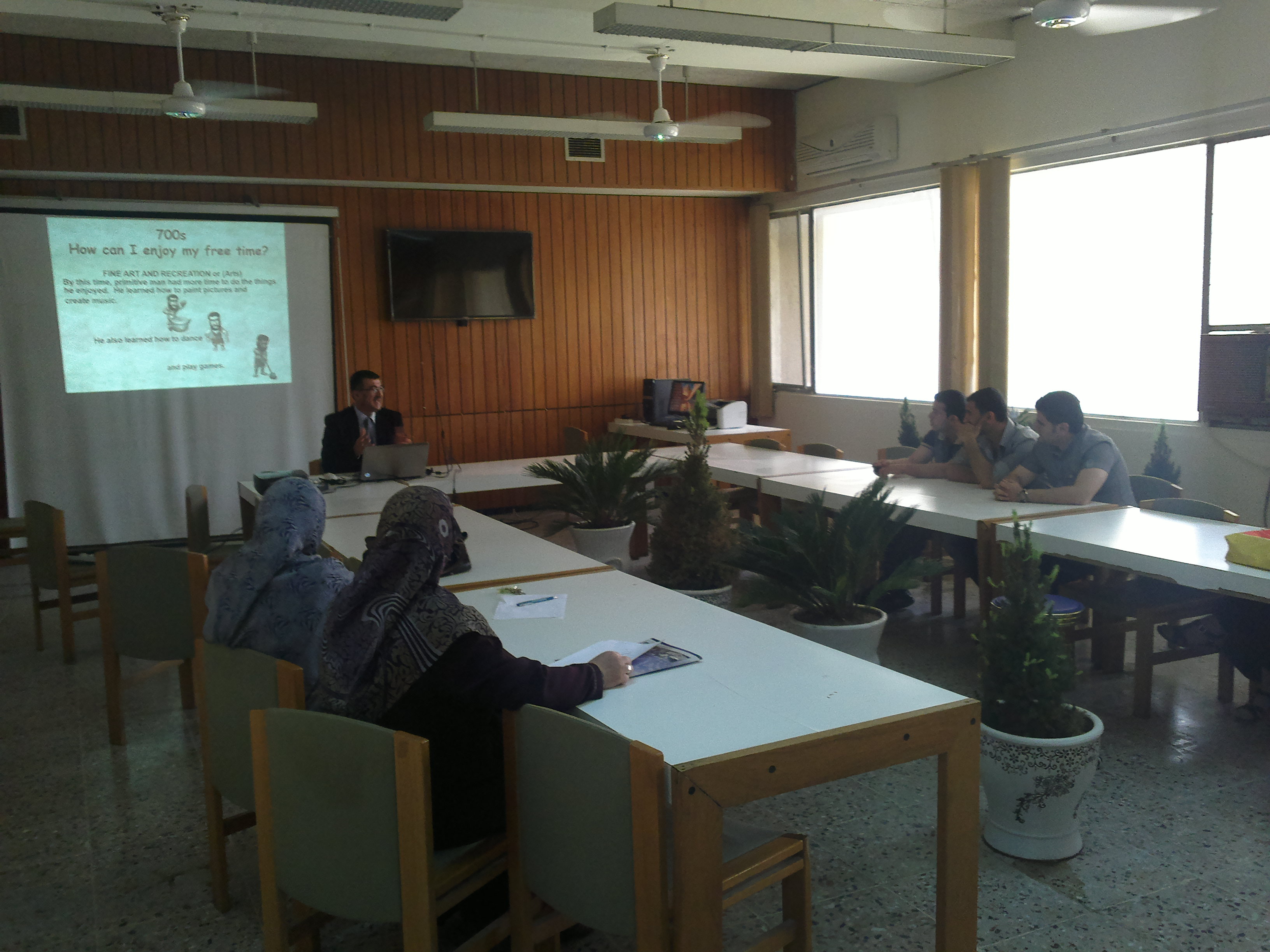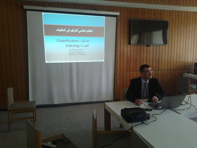 استعرض الدكتور فاضل عباس انظمة التصنيف المعتمدة عالميا في المكتبات وكيفية تصنيف العلوم وترقيمها وتطرق الدكتور فاضل عباس الى نظام ديوي العشري ونظام مكتبة الكونغرس الامريكي ووضح المحاضر كيف ان هذه الانظمة تسهل مهمة الباحث في الحصول على الكتب والمصادر.