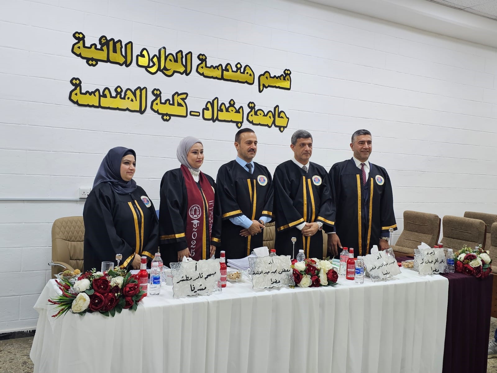 وبعد المناقشة العلمية من قبل السادة اعضاء لجنة المناقشة والاستماع لدفاع البحث وتقييم الرسالة منحت الباحثة على درجة الماجستير في هندسة الموارد المائية.