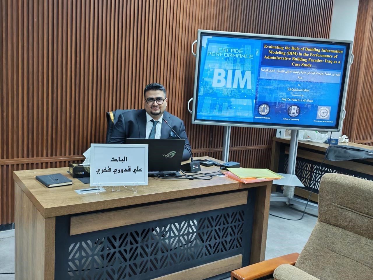 شهدت كلية الهندسة – جامعة بغداد، يوم الأربعاء 3 آيلول 2025، المناقشة العلنية لطالب الماجستير علي قدوري فخري من قسم هندسة العمارة عن رسالته الموسومة بتقییم دور نمذجة معلومات البناء في أدائیة واجھات المباني الإداریة: العراق كدراسة حالة، والتي جرت في قاعة محمد مكية بإشراف أ.د هدى عبد الصاحب العلوان.