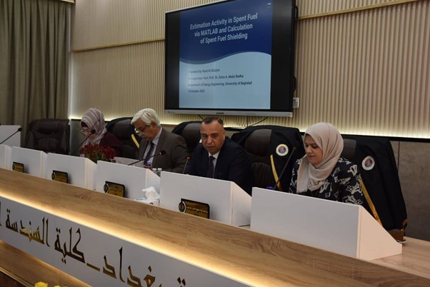 شهدت كلية الهندسة – جامعة بغداد، يوم الخميس الموافق16 اكتوبر 2025 المناقشة العلنية لطالبة الماجستير رند ستار جبار من قسم هندسة الطاقة عن رسالتها الموسومة“Estimation activity in spent fuel via analytical spreadsheet and calculation spent fuel shielding  على قاعة كلية هندسة الخوارزمي، بإشراف رئيس قسم هندسة الطاقة أ.م.د  زينة علي عبد الرضا. وحضر المناقشة السيد معاون عميد كلية الهندسة للشؤون العلمية، أ.د زياد طارق عبد علي، إلى جانب عدد من الضيوف الكرام، من بينهم السيد حامد الباهلي، مستشار رئيس الوزراء لشؤون الطاقة الذرية والسيد فاضل حاوي مزبان، رئيس الهيئة الوطنية للرقابة النووية والإشعاعية والكيميائية والبيولوجية.