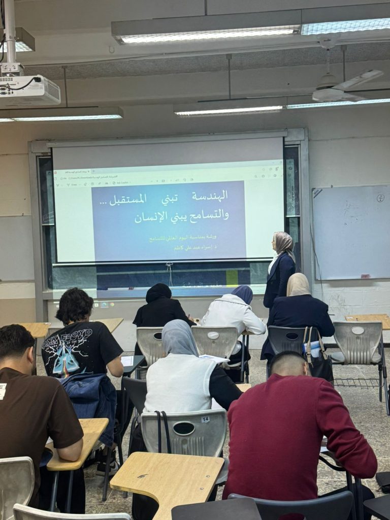 وسلّطت الورشة الضوء على أهمية تعزيز قيم التسامح وقبول الآخر داخل الحرم الجامعي، ودور ذلك في تطوير مهارات الطلبة على المستوى الأكاديمي والسلوكي. وأوضحت د. إسراء أن التسامح ليس مجرد مفهوم أخلاقي، بل مهارة مهنية أساسية للمهندس الذي يعمل ضمن فرق متعددة ويواجه تحديات تتطلب قدرة عالية على الحوار واحترام الاختلاف.