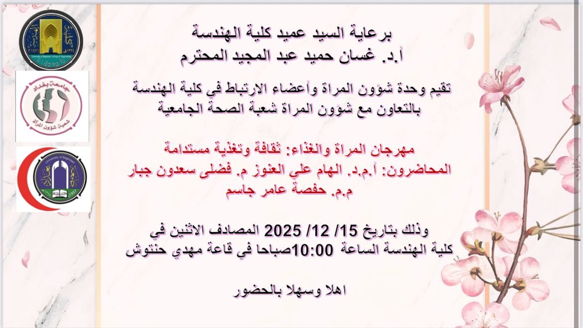 تُعلن وحدة شؤون المرأة في كلية الهندسة – جامعة بغداد عن إقامة مهرجان المرأة والغذاء،