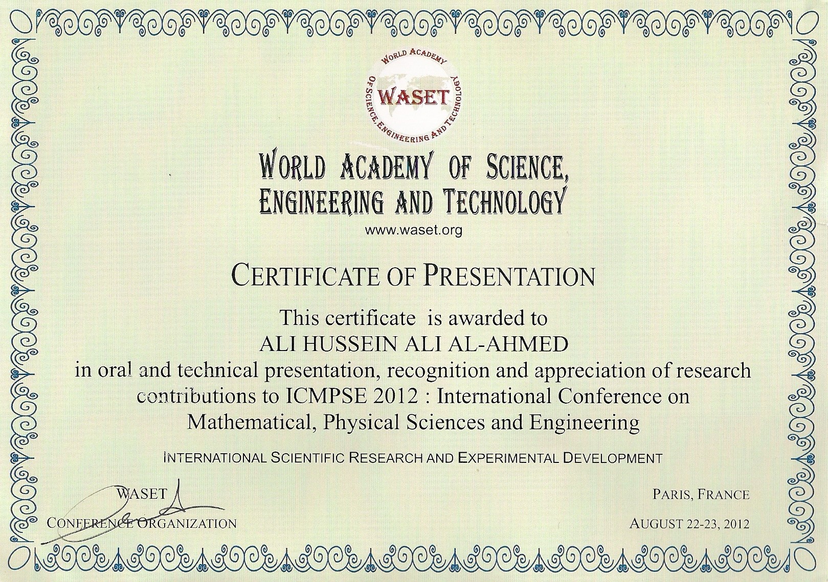 شارك المدرس الدكتور علي حسين الاحمد في المؤتمر الدولي للعلوم , الهندسة والتكنلوجيا والذي عقد في العاصمة الفرنسية )باريس( في شهر اب 2012. وقد شملت المشاركة القاء بحث يخص الاعمدة الخرسانية المسلحة المقواة بالالياف البوليمرية والمعرضة الى احمال لامركزية. وقد استعمل التحليل الاخطي باستخدام طريقة العناصر غير المحددة وبواسطة البرنامج الحاسوبي الـ (ANSYS) ليحاكي تصرف هذا النوع من الاعمدة. وقد شارك في المؤتمر عدد كبير من الباحثين من مختلف دول العالم.