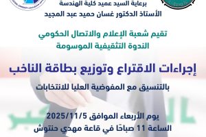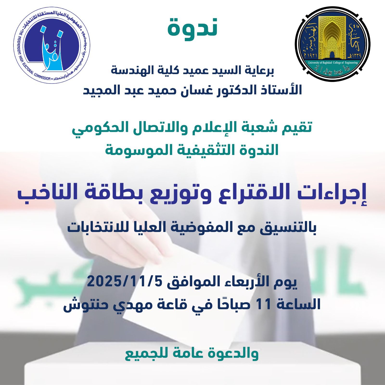 إعــــلان: هندسة بغداد تدعوكم لحضور الندوة التثقيفية حول إجراءات الاقتراع وتوزيع بطاقات الناخب