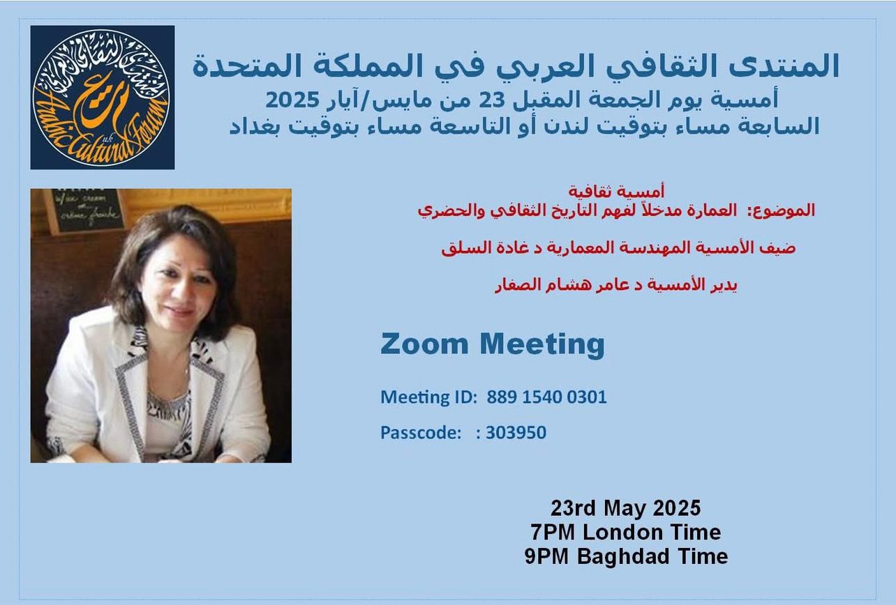 إعـــلان:المنتدى الثقافي العربي في المملكة المتحدة يستضيف أ. د غادة السلق في أمسية ثقافية حول العمارة والتاريخ الحضري