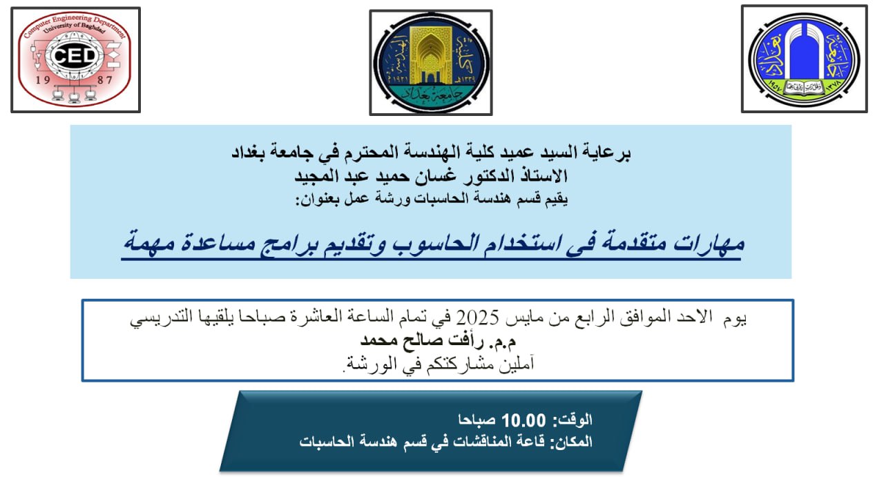 إعـــــلان: هندسة بغداد تدعوكم لحضور ورشة عمل حول مهارات استخدام الحاسوب وتطبيقاته