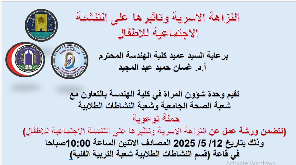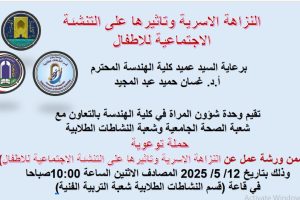إعــــلان: ضمن حملة توعوية… هندسة بغداد تنظم ورشة عمل عن النزاهة الأسرية وتأثيرها على تنشئة الأطفال
