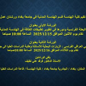 إعــــلان: هندسة بغداد تنظم ورشتان عمل حول التعاون العلمي وتطبيقات الطاقة المستدامة في الهندسة المدنية